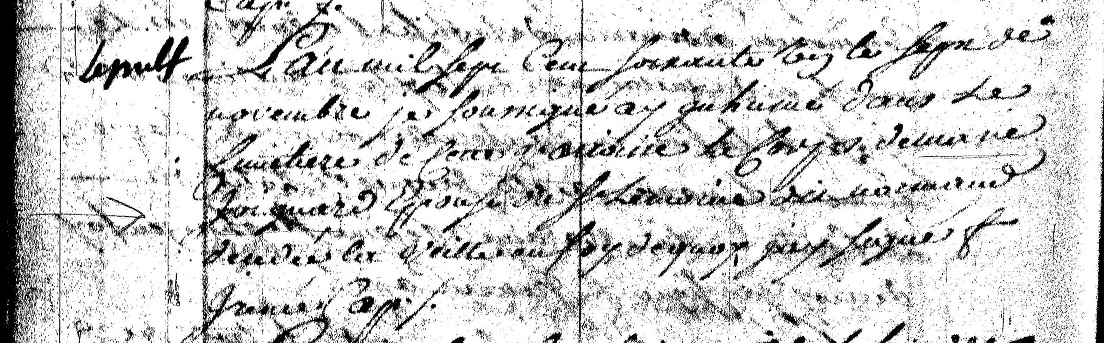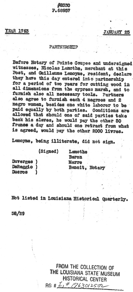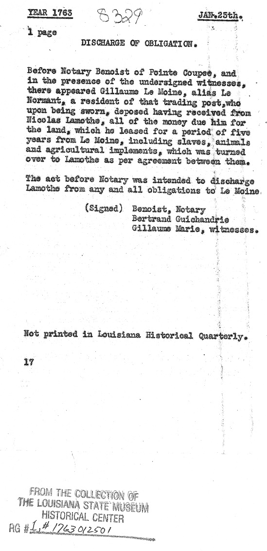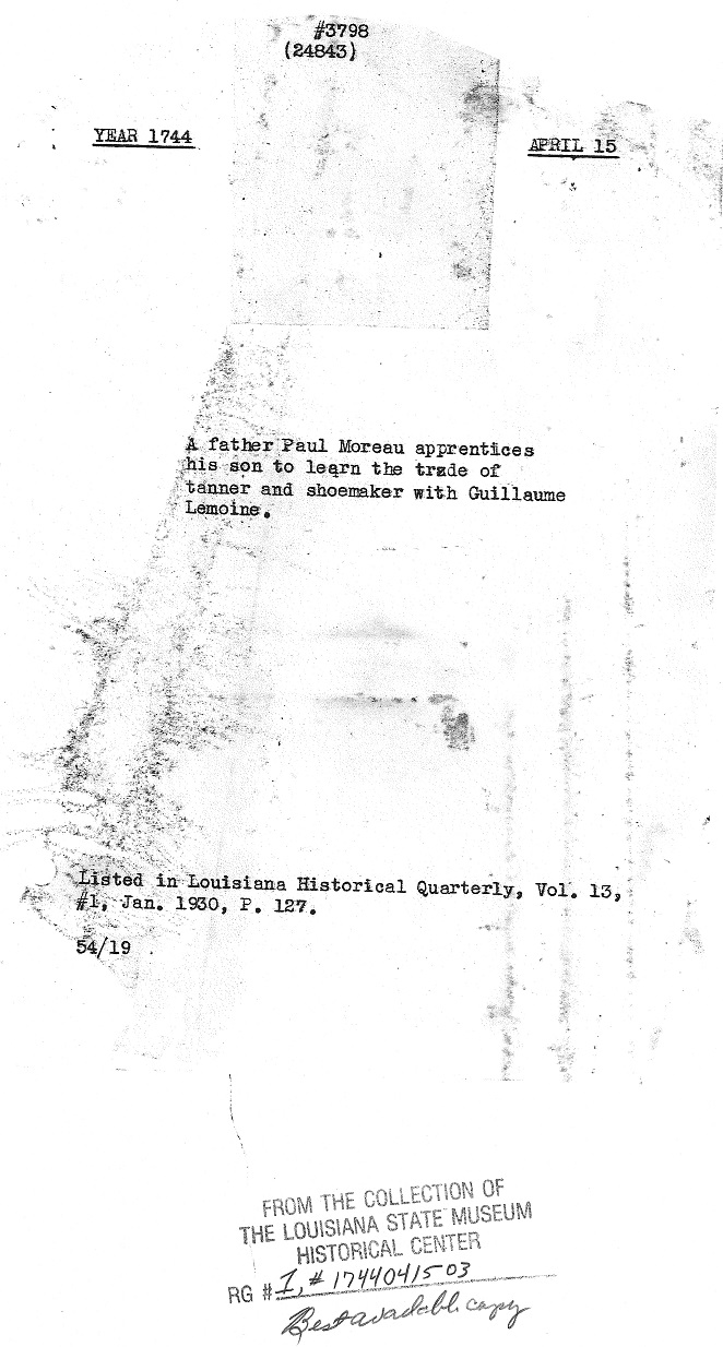 Notice served on LeMoyne. ********************************************************** In 1737, a document can be found dated 3 December in which Guillaume acknowledges his debt to the Company of the Indies. This is a description of the document as outlined in the July 1926 issue of The Louisiana Historical Quarterly: 1737 Indebtedness to the Company - Lemoine - Document Page 1 1737 Indebtedness to the Company - Lemoine - Document Page 2 1737 Indebtedness to the Company - Lemoine - Document Page 3 ********************************************************** On 20 March 1739, Guillaume Lemoine's name is mentioned in a Sale of Real Property document. The document is important because it provides some insight into where Guillaume lived sometime prior to 1739: "Sale of Real Property before Henry, Notary Royal. Marie Angelique, called Isabelle, a free negro woman, formerly owned by Mr. de Chavannes, cedes and transfers a lot numbered 95 Royal Street to Sr. Claude Villars De Breuil, Contractor for Public Works, for the King, said Isabelle having acquired said property from one Jacques Dupre, under private seal, said Dupre having had it from Francois Brunet, who bought it from Guillaume Le Moyne, who acquired it from Charles Gerbin, who acquired it from Louis Porquier, wife of Giles Goubet, to whom it had been ceded by the Superior Council. Isabelle has sold said lot for the sum of 600 livres which Sr. Du Breuil has paid cash. Signed by Du Breuil, de Chavannes, Roumier, Jahan, Henry, notary." ********************************************************** By 1741, Guillaume Lemoine and Marie L'Este Sanmerine had (at least) 6 children (Marie Jeanne, Louis, Simon, Antoinette, Marie Françoise and Jean Baptiste). (Update: Nov. 2016 - Found baptismal record for another child of this couple. Françoise was baptized on 29 June 1731 at St. Louis Church in New Orleans at the age of about three months.) The baptisms of the first two children have not been found; the last four were recorded at St. Francis Church in Pointe Coupée. On 15 November of this year, Guillaume's wife, Marie Sanmerine (identified as Marie Leste), dies at the age of 35. It is very possible that she died of complications arising from the birth of their son, Jean Baptiste, who was baptized on 24 September. The burial record states that she was "decede quatre heures" which seems to indicate that she had died four hours prior to her burial or, perhaps, she died at four o'clock. Marie's burial was recorded at Pointe Coupée: 1741 Burial of Marie Sanmerine at Pointe Coupee- Copy 11741 Burial of Marie Sanmerine at Pointe Coupee - Copy 2 ********************************************************** Sixteen months after the death of Marie Sanmerine, Guillaume Lemoine married for a third time. On 10 August 1742, his marriage to Marie Gognard (likely Gagnard) was recorded at the church of St. Francois in Pointe Coupée. The record states that the couple were married after the publication of three banns of marriage and, for the first time, the surname of his mother is identified as Madre. The document also identifies Marie Sanmerine as Marie Lete. The parents of Marie Gognard are identified as Jean Gognard and Françoise Paudrie, she is described as a "native of St. Erbilon in Bretagne, Diocese of Nantes" and indicates that she is the widow of Michel Lemoine. 1742 Marriage of Lemoine/Gagnard- Copy 11742 Marriage of Lemoine/Gagnard - Copy 2 ********************************************************** On 15 April 1744, an interesting document is found in the Records of the Superior Council of Louisiana that provides an insight into the life of Guillaume Lemoine. In this apprenticeship document, we learn that Guillaume is both a shoemaker and tanner and he has agreed to provide an apprenticeship in these two trades to the son of Paul Moreau. Perhaps more interesting, however, is the fact that Paul Moreau is going to teach Guillaume how to read and write. A synopsis of the document was provide in a 1930 issue of Louisiana Historical Quarterly. "Act before Bernard Louis Potin, notary of Pointe Coupee, between Guillaume Lemoine, called Le Normand, and Paul Moreau, who for the space of three years apprentices his son to said Lemoine to learn the trades of shoemaker and tanner, conditions and stipulated. 1744 Apprenticeship - Lemoine/Moreau - Document Page 1 1744 Apprenticeship - Lemoine/Moreau - Document Page 2 ********************************************************** On 29 June 1744, another document can be found in the Records of the Louisiana Superior Council involving Guillaume Lemoine. The following description of the document can be found in the January 1930 issue of The Louisiana Historical Quarterly: 1744 Obligation to build house for Lemoine - Lemoine/Payev - Document Page 1 1744 Obligation to build house for Lemoine - Lemoine/Payev - Document Page 2 ********************************************************** Guillaume Lemoine and his wife, Marie "Gonnard" are listed on the 1745 Census of Pointe Coupee. ********************************************************** On 6 March 1748, Guillaume Lemoine entered into a Contract of Apprenticeship with Maurice Levesque for the benefit of Guillaume's son, Louis. A synopsis of the document was provided in a 1936 issue of The Louisiana Historical Quarterly: "Contract of Apprenticeship, passed before Notary, between Guillaume Lemoyne, acting as tutor to Louis Lemoyne, aged sixteen years, and Maurice Levesque, a cobbler. Said Louis Lemoyne to be bound to Levesque for three years, on stipulated conditions. ... Signed: Chantalou; Lenormand; Henry, notary". 1748 Apprenticeship Contract - Lemoine/Levesque - Document Page 11748 Apprenticeship Contract - Lemoine/Levesque - Document Page 2 1748 Apprenticeship Contract - Lemoine/Levesque - Document Page 3 ********************************************************** After nineteen years of marriage, Marie Gagnard (Joignard) died on 6 September 1761 ("la veille" - the eve). She was