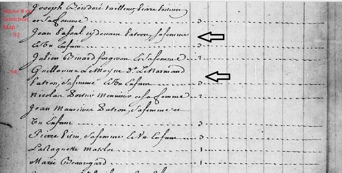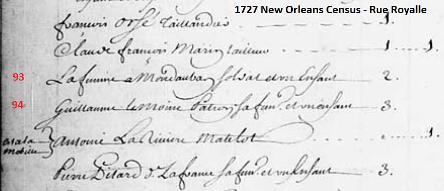 not recorded? There was a "Le Normand" enumerated in Illinois in the 1726 Census - Page 14. He was living alone with one "slave savage". Could Guillaume have been in Illinois at the time that their census was taken and was, therefore, enumerated twice in the same census? A year later, in 1727, "Guillaume LeMoine Patron La fem. et un enfant" (Guillaume Lemoine, Patron, his wife and one child) is, once again, found on the census in New Orleans living on Rue Royalle. (Note: A patron is defined as a boss, employer or owner in the french language. Guillaume was identified as a "patron de Chaloupe de la compagnie" in his 1725 marriage record to Marie Sanmerine.) ![]() Based on info regarding Guillaume in the 1726 and 1727 census records, I believe that Guillaume's dwelling/house on a 1728 New Orleans map by Sr. Gonichon entitled "Plan de la Ville Nouvelle Orléans comme elle était en May 1728" (Plan of New Orleans as it was in May 1728) can be confirmed as dwelling number 94. According to the map legend, 'Sr. Le Normand' is living on the south side of the street on Rue Royalle between the two cross streets now known as St. Ann Street and Dumaine Street. The names of these north/south cross streets are not identified on this map. According to the Vieux Carré Virtual Library, "Le Normand" has been identified on the Chain of Title for the current building located at 824 Royal via their 1728 and 1731 source maps (the Broutin map is their 1728 source and the 1731 Gonichon map is their 1731 source.) It is unclear which method Gonichon used to gather the data for this map although it could be assumed that he used some data physically gathered in early 1728 as well as data from the previous two census documents. In a snippet of the Gonichon map legend below, you can see that dwelling number 92 was occupied by Sr. Pascal. This can be compared to the 1726 census in which Pascal is, indeed, living two doors away from Guillaume. The 1728 legend also shows that dwelling 93 was occupied by Sr. Montauban and this appears to match the name of the occupant living next door to Guillaume in the 1727 census. However Pascal is not found on the 1727 census living two doors away and Montauban was not listed on the 1726 as his next-door neighbor. It is unclear why several of the other occupants on either side of Guillaume don't match between the 1726 and 1727 census records and the 1728 Gonichon map, but it's likely that many of the inhabitants did not remain in the same location for long periods. Some, of course, were likely employed by the Compagnie des Indes and, as a result, engaged in activities related to their contracts with the company which likely took them away from New Orleans for long periods. In some instances, they likely did not own the homes and, when they departed, the dwelling was rented by someone else. It's also likely that some of the dwellings were owned by the Compagnie des Indes and used by company employees as needed. ![]() ![]() ********************************************************** In the records of the Louisiana Superior Council, there is a petition dated 20 December 1730 (3pp. No. 30274. See 314) which could be related to Guillaume and