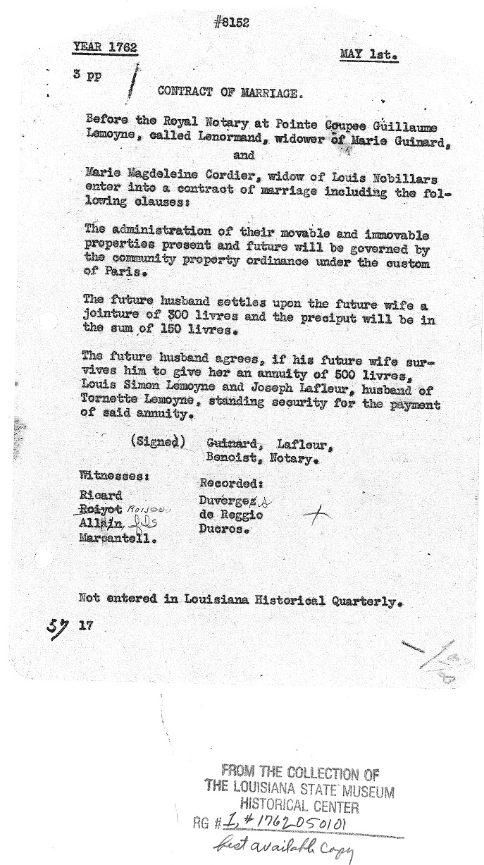 What do we know about Guillaume Lemoine (c1699-1771)?Guillaume Lemoine, progneitor of a majority of the Louisiana Lemoines, was supposedly born c1699 in Le Havre, France, located in the Department of Seine-Maritime (Region - Normandie). However, after searching the Catholic sacramental records of Le Havre, it appears that Guillaume was not baptized there nor is there any indication that his parents were baptized, married or baptized other children there (Notre Dame or St. Francois of Le Havre). It is possible, however, that the family moved there after the birth of their children and, as a result, left no sacramental paper trail. NOTE: There is NO indication that Guillaume Lemoine was, in any way, related to the infamous 'Le Moyne' family (Iberville & Bienville Le Moyne) although there are several sites on the Internet that make this claim simply because the father of Guillaume is, supposedly, named 'Jacques' (same name as one of the siblings of the infamous Le Moyne brothers). The first indication of Guillaume in the new world appears to be a marriage contract entry which appears in the Kaskaskia Manuscripts (Illinois) between 'Lemoine' & 'Ledoux' dated 28 April 1722. Another page from the Kaskaskia Manuscripts provides the first name of the bride & groom: Guillaume Lemoine & Theraize LeDoux. (NOTE: Although it has always been speculated that this Kaskaskia marriage is, indeed, OUR Guillaume Lemoine, it cannot be proven 100% at this time. However, we do know that Guillaume Lemoine worked for the Company of the Indies, was a captain of a boat and that, to date, no other Guillaume Lemoine has been found in early colonial records. Does this prove that the marriage to LeDoux is our Guillaume? Not necessarily. However, there is a very strong possibily that this marriage is referring to our Guillaume and should be noted with the usual degree of suspicion.) Close-up of Lemoine / LeDoux marriage entry from page listed above Reference to marriage contract between Guillaume Lemoine & Theraize LeDoux from Kaskaskia Manuscripts ********************************************************** Brown and Dean's "The Village of Chartres in Colonial Illinois", pages 810-811, refers to an act passed before the Notary Buffereau de Bellegarde, at Fort de Chartres on 17 May 1723 which would seem to indicate that Theraize (Thérèse) LeDoux was deceased. "Guillaume Lemoine...captain of a bateau of the Royal Indies Company, who, being ready to make a trip to the seas, and wishing in case of death to dispose of his property and affairs, hereby gives, cedes, and abandons, in case of death, to Francoise, daughter of Therese LeDoux dit Latreille, in her lifetime wife of the giver, all his property and effects...for the sake of the friendship and affection he has always felt for the said Francoise." (This was executed and done in the Storehouse of the Royal Indies Company at Fort de Chartres on the 17th of May 1723. The said Guillaume has declared that he does not know how to sign the document. K345) (Document) (NOTE: It has been brought to my attention that this document is likely referring to a son of Therese (Thérèse) LeDoux dit Latreille named François rather than a daughter named Françoise. Upon close examination of the document, it appears that the child's name appears to lack an 'e' at the end which would indicate that the child is a male. The word 'daughter' in french (fille) almost appears to be 'fils' (son) although this is not quite as easy to accurately decipher as the two occurrences of the child's first name. However, based on the spelling of the first name, I would tend to agree that the child was probably a male.) ********************************************************** On 4 April 1725, Guillaume Lemoine married Marie Sanmerine in New Orleans.