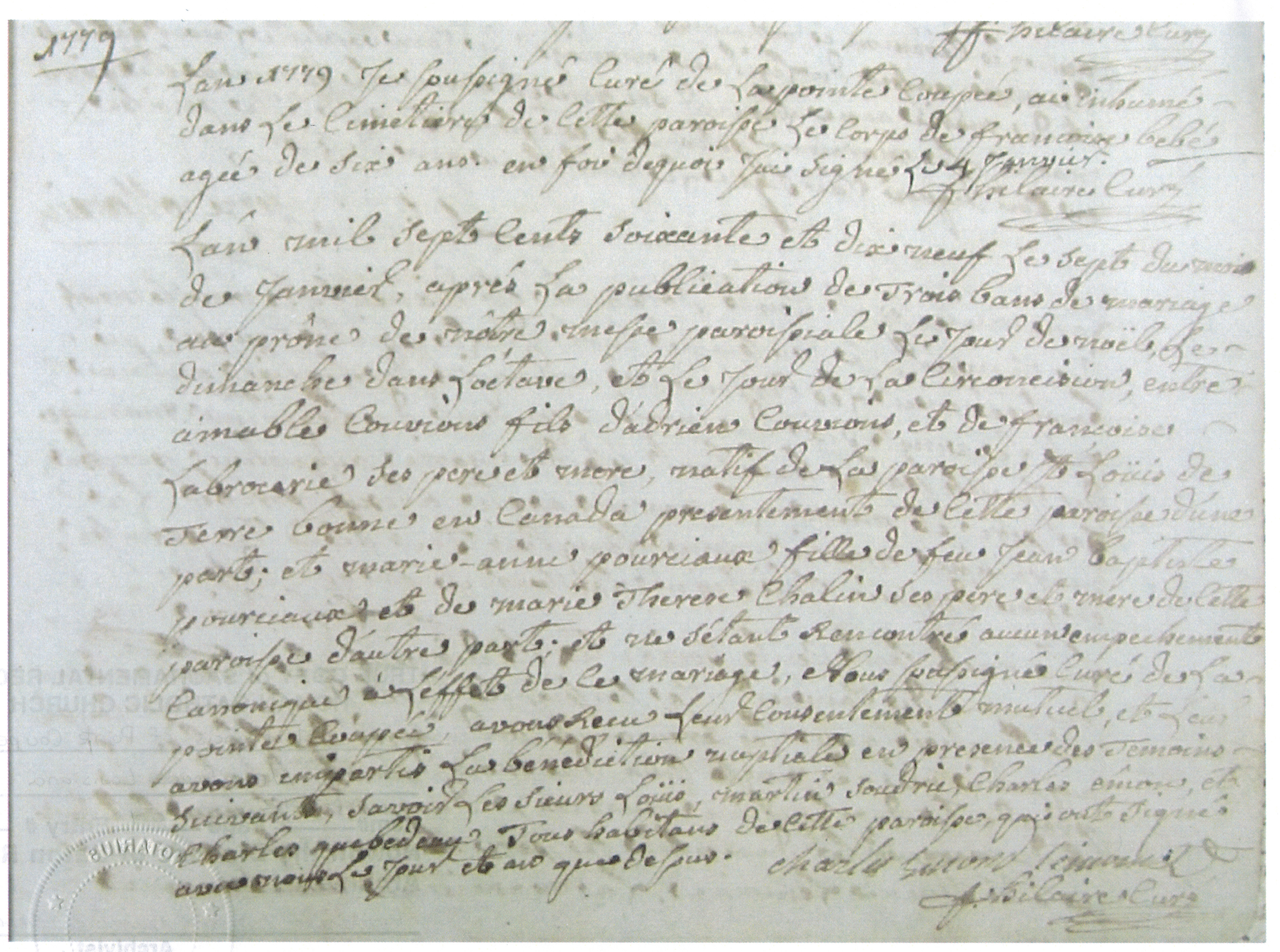 | Home Surname List Name Index Sources Email Us | Ninth Generation330. Adrien Amable COUVILLION was born on 17 March 1751 and baptized the same day in Laval (Sainte-Rose-de-Lima) (Quebec Province), Canada.1,1137 He died before 2 January 1808. According to a document found in his succession file, an application for Letters of Administration was filed on that date by Pierre Couvillion, his son. There is also another document in the file dated 29 December 1808 regarding his inventory.1,1138 Marianne POURCIAU/POURCEAU and Adrien Amable COUVILLION were married on 7 January 1779 at St. François d’Assise Catholic Church & Cemetery in (Pointe Coupée Parish), Louisiana, USA.1,1140,1141 331. Marianne POURCIAU/POURCEAU was born on 25 October 1759 in (Pointe Coupée Parish), Louisiana, USA.1142 She was baptized on 4 November 1759 in (Pointe Coupée Parish), Louisiana, USA.1142 She died before 1828. According to Ira Couvillion's book entitled "To Avoyelles with the Couvillions", she was buried in New Orleans but no such record has been found. NOTE: There is a lot of mis-information that has been distributed about the parents of Adrien Amable Couvillion, husband of Marianne Pourciau/Pourceau. In order to clarify the names of his parents, I'm posting the Couvillion-Pourceau marriage record here. As you can see, his parents are identified as "Adrien Couvions" and "Françoise Labrocarie". The actual name of his mother is Marie Françoise Boullerise (Boulerise, Bourhis, Boulerice). He is not the s/o Jean Baptiste Quévillon and Marie Anne Cadieu.: