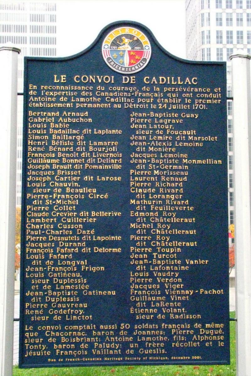 | Home Surname List Name Index Sources Email Us | Eleventh Generation1612. Edmond ROY dit CHÂTELLERAULT was born in 1675 in Canada. On 27 May 1701, he was one of 42 men hired by Sieur Jean Bochard, the chief clerk of the Company of Canada at Montréal, as a voyageur to travel to Détroit. These men traveled with Antoine de Lamothe Cadillac and established the permanent settlement at Détroit. PLAQUE The convoy arrived at their destination on 24 July 1701. According to the contract signed by Edmond Roy, the voyagers were not allowed to trade for profit. Those hired would be fed at the expense of the King "according to the usual custom for voyageurs" and they would be paid for "each year of service beginning the 1st day of June next year...", 300 livres of French money "which totals 400 livres du pays". (Article: "Marché pour le detroit… 27 mai 1701, Adhémar, notaire royal"; Translated by Suzanne Boivin Sommerville; Habitatheritage.org) This seems to indicate that they were paid 100 livres at the onset of their voyage. According to an article by Suzanne Boivin Sommerville entitled "314th Detroit Birthday Post: The Question of Who Was at Détroit when the 1701 Convoy Arrived" (FCHSM Facebook), "Edmond Chastelraut (Roy dit)" was one of the men who traveled to other locations some distance away to trade with the Indians. The men who participated in these extra voyages were paid additional money. However, it is apparent that Roy returned to his family at La Pérade no later than the early months of 1703 because his wife gave birth to their daughter, Marie-Françoise, on 11 November 1703. According to "Cadillac's Village", Edmond Roy dit Chatellereau "agreed to come to Détroit July 28, 1704, as brigadier (foreman of a boat's crew). He was to receive 300 livres for the trip. While he never resided in Détroit, his son Joseph did, and was married here in 1736 to Magdeleine Perthuis" ("Cadillac's Village; Compiled by C. M. Burton, 1896 ... and ... "Engagé Contracts to Détroit 5 April 1721 to 22 May 1731 Part 2"; Diane Wolford Sheppard, FCHSM). 2210 He died before 23 October 1720. On this date, a document was filed regarding the tutorship of his five children. Edmond is listed as deceased. According to Jetté's book ("Dictionnaire généalogique des familles du Québec"), his burial record has not been found but Jetté indicates that Edmond, likely, died at La Pérade. 2939 A tutorship document was filed on on 23 October 1720 regarding the children of the deceased Edmond Roy. Marie Anne JANVIER (JEANVIER) and Edmond ROY dit CHÂTELLERAULT signed a marriage contract on 6 February 1701 in La Pérade (Quebec Province), Canada.2211 They were married on 7 February 1701 in Sainte Anne-de-la-Perade (Québec Province), Canada.1,2212 1613. Marie Anne JANVIER (JEANVIER) was born on 20 April 1682 in Cap-de-la-Madeleine (Québec Province), Canada.1,2213 She was baptized on 26 April 1682 in Cap-de-la-Madeleine (Québec Province), Canada.1,2213 She died on 2 March 1762 at the age of 79 in (Québec Province), Canada.1,2214 Marie was buried on 3 March 1762 in Sainte Anne-de-la-Perade (Québec Province), Canada.1,2214 [Note: Marie Anne was married a 2nd time to Louis Goüin on 5 May 1733 at Sainte Anne-de-la-Perade.] Children were: